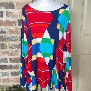 Same or Next Day Shipping! NWT Westbound Geometric Shapes Colorful Long Sleeve Top Size 3X. Primary Colors. Ribbed fabric. Bateau neckline. Long sleeves with split asymmetrical hem. Brand new condition. Approximate measurements in photos.