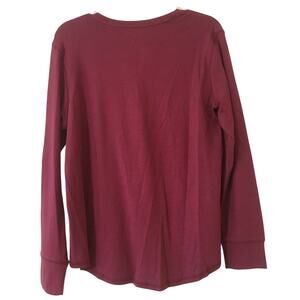 Westbound cotton blend small burgundy V-neck long sleeve seem down the middle curved hem slightly shaped at waste.