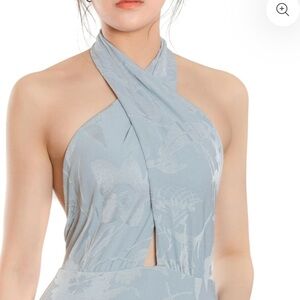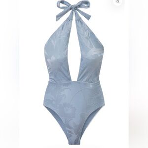 Stylish halter neck swimsuit in a soft light blue shade. Features a chic design with a subtle floral pattern.