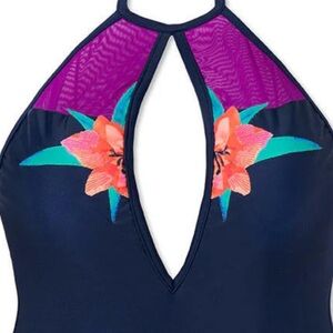 Stylish navy halter swimsuit featuring a vibrant floral design. Perfect for beach days.