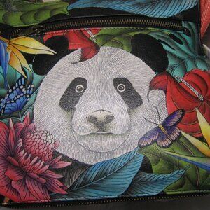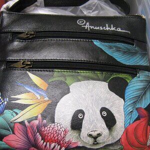 NWT Whimsical Panda Anuschka Leather Expandable Travel Crossbody features a curious hand-painted panda on genuine leather and lots of pockets to make travel easy. It also expands a little to provide extra room. A playful panda pokes its head through a colorful collection of flowers as butterflies flutter around in an art piece that will bring a smile to your face and those who see it. Designed for both beauty and form, the bag features a top zip entry, a full-length zippered wall pocket inside, an open wall pocket, 2x multipurpose pockets, 2x rear zippered wall pockets, and an extended zippered gusset which adds depth and accessibility to the bag. Dimensions: Width: 9”; Height: 8.5”, Depth: 2.5”; Adjustable shoulder strap with drop up to 25".