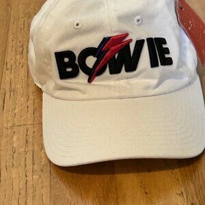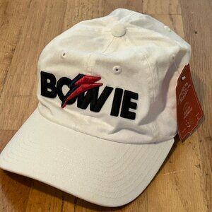 For the die-hard David Bowie fan, a white baseball style cap emblazoned with Bowie's name in block letters and a red lightening bolt in the middle. Brand new, never worn, tag still attached.