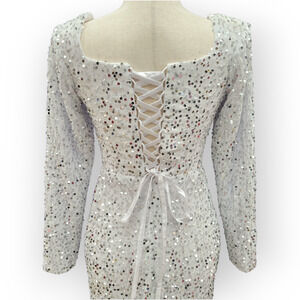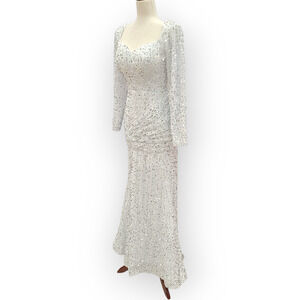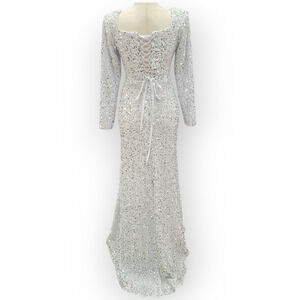 NWT White Fitted Long Sleeve Sequin Gown with Leg Slit and Corset Back
