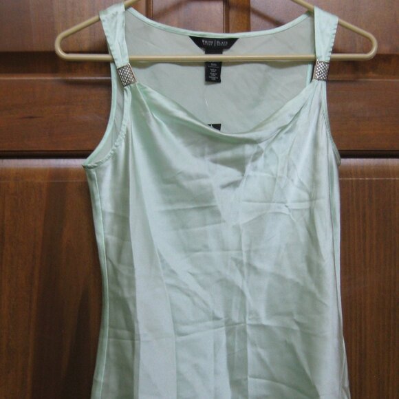 This 95% silk, 5% polyester shell would be a feminine addition to any wardrobe. Color is Divinity, I call it sherbet green. Size is XXS