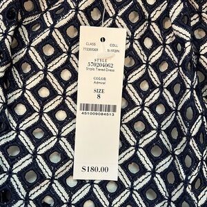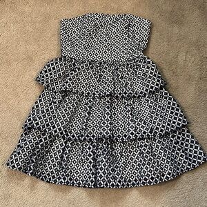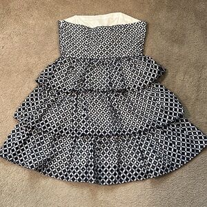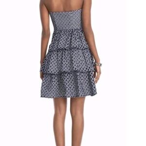 NWT Beautiful White House Black Market dress. Strapless. Navy and white cut out design. 3 Tiered ruffled skirt. Dress 100% cotton. Embroidery 100% Polyester. Lined. Perfect condition.