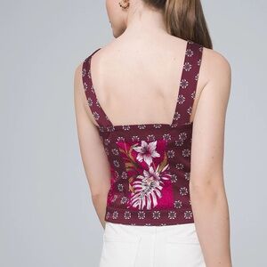 Pattern play at its best. Shades of pink and maroon plus varying shapes of florals create a unique tank. Body skimming fit with thick straps wide enough for you to opt-out of a strapless bra (sweet!). While there is definitely a resort vibe to this sleeveless top, it will fit in nicely in your backyard or your friends. Try it with our Smooth Stretch Shorts.