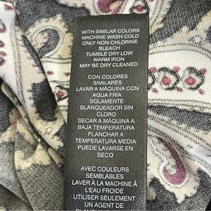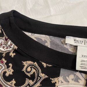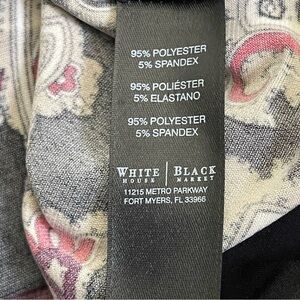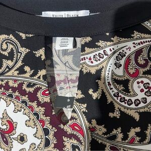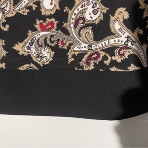 This pretty dress is a paisley print consisting of black, beige, white, red and a wine color. There is a 4” teardrop opening at neckline and a one inch black band at collar and 3” band at hemline. Fabric is 95% polyester and 5% spandex, machine wash and dry. Other measurements are length 31” and pit to pit 17”.