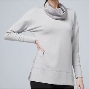 This stylish White House Black Market pullover offers a sleek, modern look with functional side zippers and a luxe funnel neck collar. Made from a soft rayon blend with a silky trim, it’s perfect for layering and lounging in comfort.