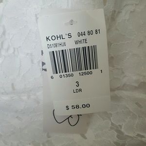 White lace dress, fits tight up top and flowy on the bottom. You can also remove the straps and wear this dress strapless. (: