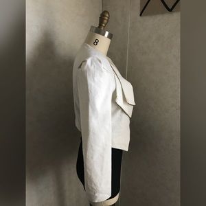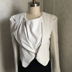 A soft light fitted moto jacket with a stylish front double zip closure that can be zipped multiple ways as pictured above. Beautiful jacket (one of my favorite pieces in my wardrobe) never worn too snug in arm area.