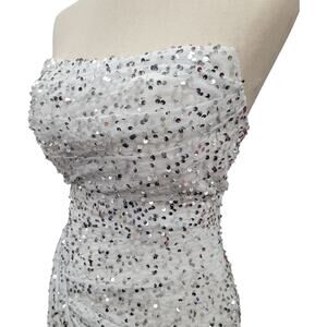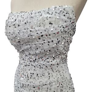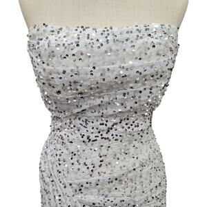 NWT White Silver Strapless Sequin Evening Gown with Corset Back on Velvet Fabric