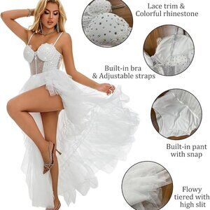 This tiered white tulle dress combines elegance and sparkle with thoughtful design details. It features a sweetheart neckline, delicate adjustable spaghetti straps, and a corset-inspired empire waist with elastic strips for a secure and customizable fit. The A-line silhouette features a dramatic high-low ruffled hemline with a daring side slit, complemented by colorful rhinestone embellishments that add a touch of luxury and glamour.