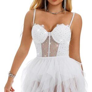 NWT! White Tulle Party Dress A Line High-Low Ruffled Fit w Corset Top Size L/12