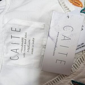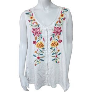This stylish Caite white tank top showcases intricate floral embroidery along the V-neckline, adding a vibrant touch to its relaxed design. The sleeveless top is perfect for casual outings, offering a cheerful and colorful look. Its embroidered style makes it a standout piece in any wardrobe.