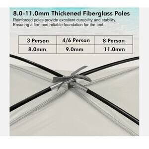 8.0mm Thickened Fiberglass Rods: We increased the thickness of the fiberglass rods to 8.0mm to make it more flexible, sturdy and durable. It can support the tent more stable and will keep shape even after long time use.