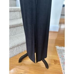 Excellent condition. Slinky black ribbed material. Asymmetric straps with a draped neckline. Two side cut outs that can be adjusted with ties. Midi length with single side slit.