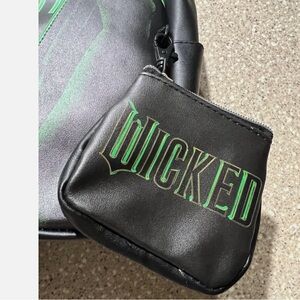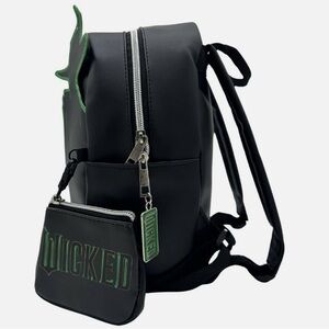 NWT "Defy Gravity" mini backpack from the movie Wicked is very stylish and bold. This Wicked backpack features the Elphaba character in a striking black and green design a detachable coin purse, adjustable straps, a main compartment, 2 side pockets, a front zippered pocket and 3 interior pockets. backpack is designed to carry your essentials and great for travel. Perfect for fans and fashion enthusiasts alike. Please note that the top half of the Elphaba character is made of faux leather and typically may not stand up on its own. The hat and head of Elphaba tend to fold downward which is a result of the design. Please see all photos.
