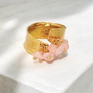 NWT Wide Band Ring 18K Gold Plated Rose Quartz Beads Open Adjustable Size