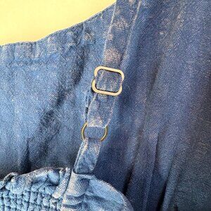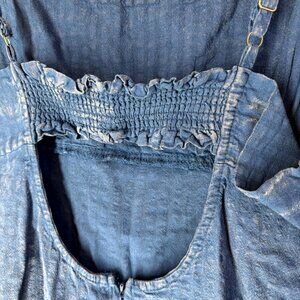 Cute lightweight denim dress with an empire style waist and a ruching band in the back bust.