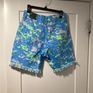 Classic 5 pocket style jeans shorts with paint splatter design of green and pink.