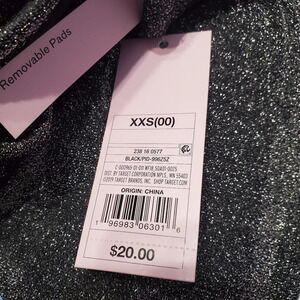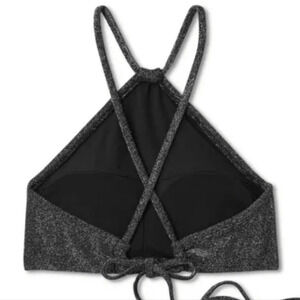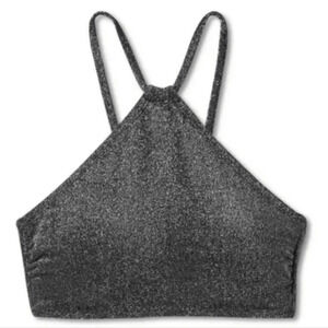 Black lurex bralette bikini top from Wild Fable with a halter-style high neckline. Made of soft fabric with a blend of metallic fiber and spandex. Slender shoulder straps make a crisscross design at the back and fasten for an adjustable fit.