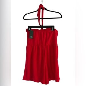 Vibrant red strapless romper. Features a tie detail at the top. Perfect for casual outings.