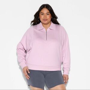 Cozy light purple hoodie with a front quarter zipper. Ideal for layering. Quarter zip, bat type sleeves. Slightly cropped. Not a fuzzy type sweatshirt, more of a cotton lightweight sweatshirt. Retails $25. Elastic waistband and collared. Color is listed as “light violet”