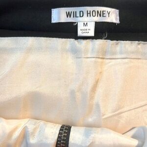 NWT Wild Honey Metallic Panel Mini Skirt Modern Chic Night Out Statement Size M Turn heads the moment you walk in — this NWT Wild Honey metallic-paneled mini skirt is a full-on statement piece with its bold geometric blocking, faux-leather silver panels, and sleek black contour lines that sculpt the silhouette.