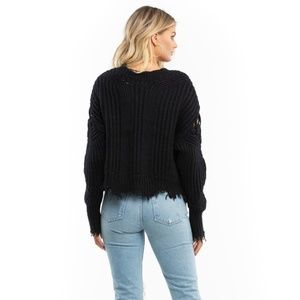 The Wildfox Alyx Sweater is oversized and features a chunky rib knit design with frayed hem, relaxed fit, and intricate design at neck and sleeves.