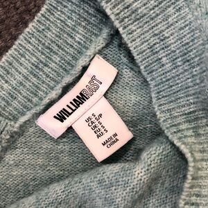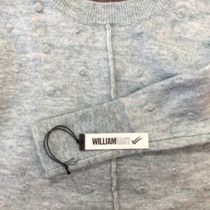 Sky blue, NWT William Rast v-back sweater with all-over bobble texture. Front is crew-neck with exposed seam allowance, back is v; can also be worn with v-neck in front. Long sleeves. Color is more accurate in close-up images.