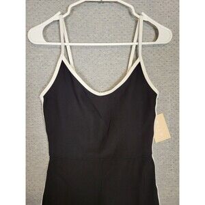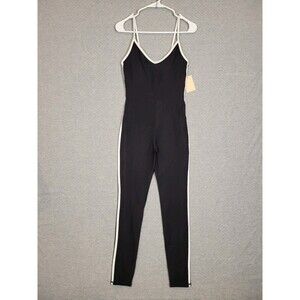 This was originally a 3 piece set, but this listing is for the one piece jumpsuit only. It is black with white edging and white side stripes. It is a ribbed, stretchy material, and it features adjustable straps, and padded cups in the bust.