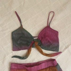 This delightful ensemble combines comfort and style effortlessly. The top, reminiscent of a chic bathing suit, features adjustable spaghetti straps, and a trendy tie-front detail, allowing you to customize the fit to perfection. Crafted with a shimmering fabric in vibrant raspberry, green,and yellowish gold hues it adds a touch of glamour to any occasion.
