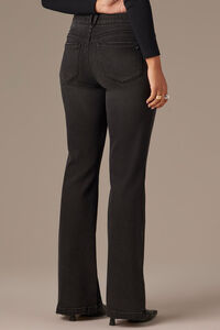 High-waisted bootcut jeans with a fitted bodice, front and back pockets. Soft and stretchy material.
