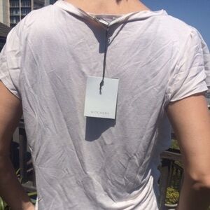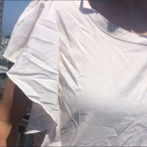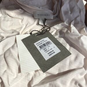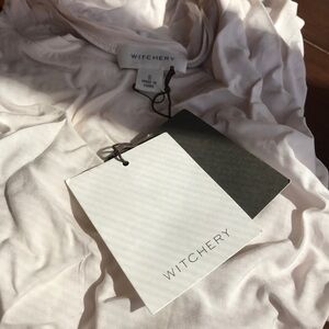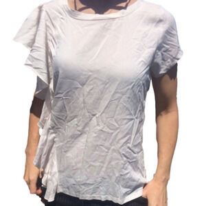 NWT Witchery Blouse with side ruffle. Oyster color, off-white, ivory. Double crew neckline detail. Short sleeves. Size small. 100% viscose. Front panel, sleeves and ruffle is a linen like weave. Back panel is more or a soft jersey knit weave.
