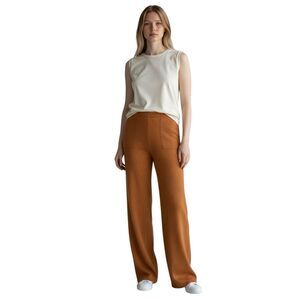 Luxurious wide-leg trousers crafted from 100% pure cashmere in a warm lion-brown tone. Designed with a flattering high-rise waist and elastic waistband for comfort, featuring front patch pockets and a relaxed, fluid silhouette that drapes beautifully with every step. The knit structure offers a softly textured feel while maintaining a refined, elegant look.