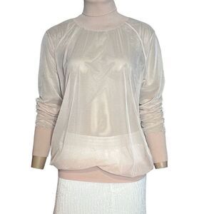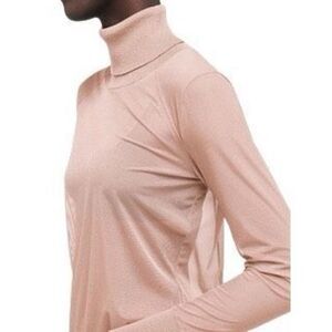 $525 NWT Wolford Tony Pullover Turtleneck Top. Size M. Model #52757. Color Petal Rose - light gentle pink. The top is a lightweight, sheer, long-sleeve turtleneck sweater in a soft, nude or blush pink color. It is made from a fine, translucent fabric that subtly reveals the skin or any layers worn underneath. The design features a high turtleneck collar, and the material has a slight sheen to it, giving it a delicate and elegant appearance. The sweater has a blouson silhouette with ribbed cuffs and a ribbed hem, which adds a bit of texture and structure to the otherwise smooth fabric. This top is likely intended for layering due to its sheer quality.