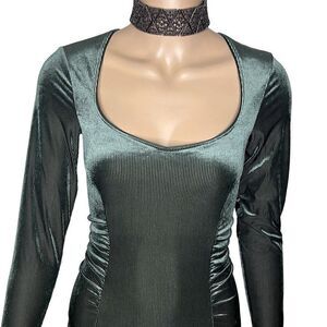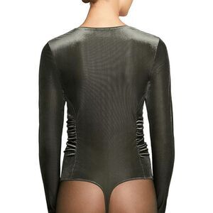 $374 NWT Wolford Esmeralda String Body. Size M. Color Dark Green. Striped Velvet, Long Sleeve. This string body is easy on the eyes with its gentle material and draped front-design. Super soft striped velvet features a lined front part. This body blends timeless material with a modern sensibility for a look that brings out the best of both. Form fit / Lightweight striped velvet / Lined front part / Long sleeves / Heart-shaped neckline