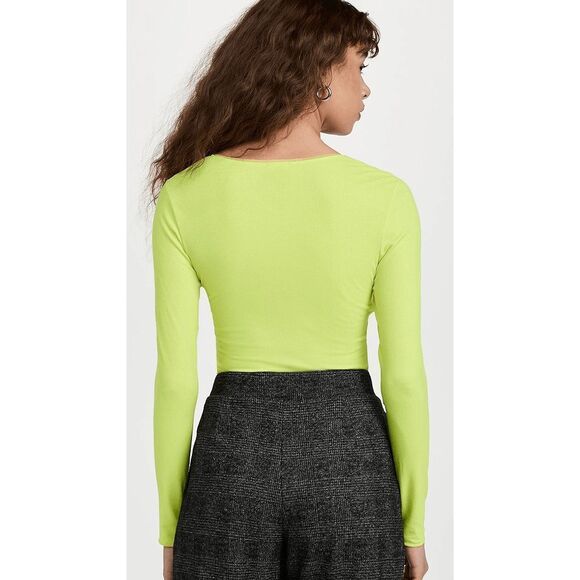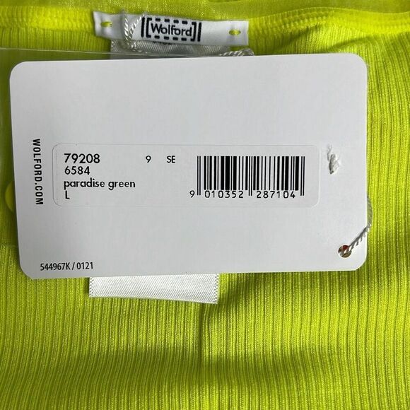 $265 NWT Wolford Henley String Body. Color Paradise Green. Size L. Soft rib jersey material in modal elasthan quality provides a snug and relaxed fit. A button tab below the neckline adds additional customizable detail. Soft rib jersey. Modal elasthan quality. Button tab at front. Long sleeves. Thong back with snap gusset. Scooped neckline with partial button placket. Neon color is brighter than it appears in still photos. 93% Modal, 7% Elastane. Has an extra button.