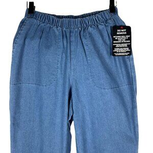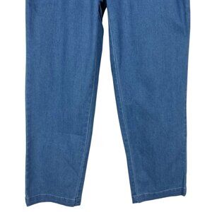 A brand new pair of Woman Within Straight Leg Fineline Pull-On Stretch Denim Jeans in Stonewash Sanded. These are elastic waist jeans with pockets and each hip.
