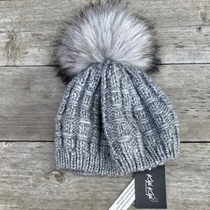 NWT Woman’s HORIZON FAUX FUR BEANIE Gray Knit Beanie Pom-Pom Wool Blend OS