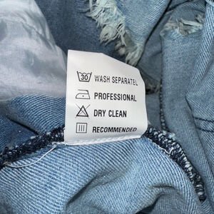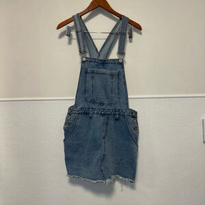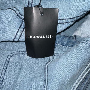 This HAWALILI denim overall dress is light blue, features adjustable straps, a front pocket, side pockets, and a frayed hem. The denim is medium weight. It has a relaxed fit. The dress is approximately 30 inches in length. All tags are attached. No visible imperfections.