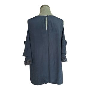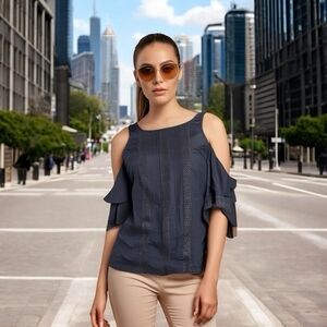 Discover the chic elegance of the NWT Ann Taylor Navy Blue Cold Shoulder Blouse, featuring unique crochet lace #designs and rushed tiered sleeves. This #blouse is crafted from 100% rayon, ensuring a soft and comfortable fit.