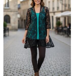 NWT ~ Women's 3 Piece Set ~ Teal Cami Black Lace Cardigan & Pants ~ Plus Size 3X