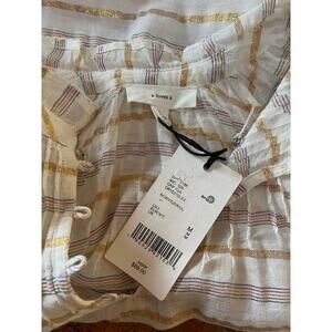 This shirt is so pretty! It is brand new with tags! There are buttons on the front and the sleeves are very flowy! It has a mock neck style, too. There are flaws on either side of the shirt on the bottom of each side. This can easily be fixed with stitching! There is also a tiny mark on the back, as seen in photos. Measurements are in the photos. Womens size medium! This retails for $89!