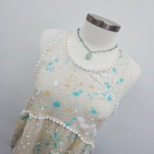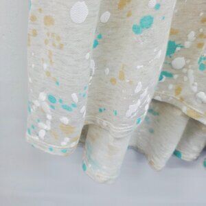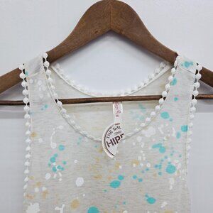 NWT Womens Babydoll Tank Top S Beige Paint Splatter Print Sleeveless Pom Trim