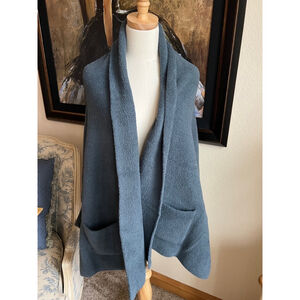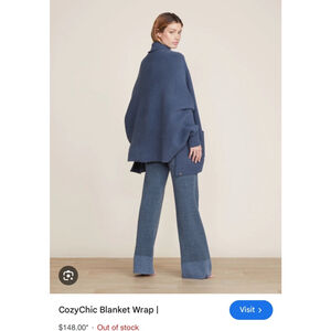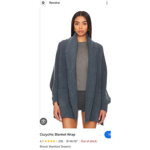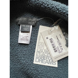 Brand: Barefoot Dreams. Model: CozyChic Blanket Wrap. Condition: New With Tags / Box. Color: Smokey Blue. Material: 100% polyester CozyChic knit. Size: One Size. Features: Oversized, shawl collar, two pockets. Dimensions (approximate): Length 36 inches, width 50 inches.
