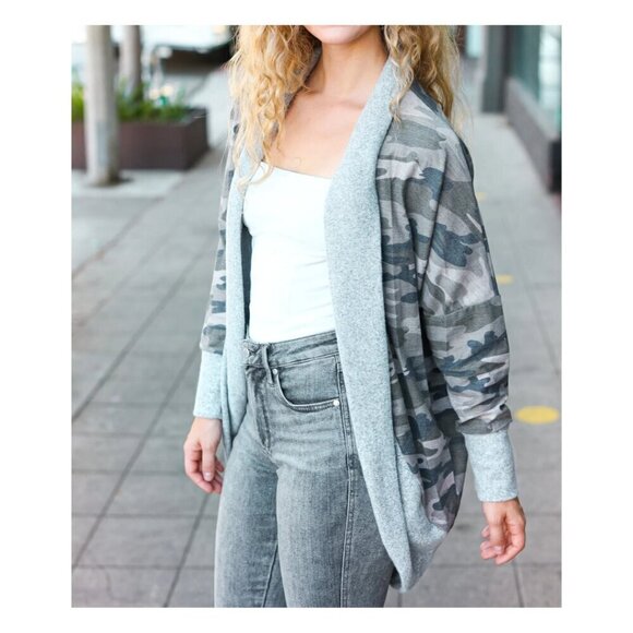 Stay comfy and effortlessly stylish in this French Terry Open Front Cardigan! Featuring a trendy camo print contrasted with soft heather gray trim, this cozy layering piece is perfect for lounging at home, casual outings, or running errands in style. The relaxed draped silhouette flatters every shape while keeping you warm and chic. Long sleeves with cuffed wrists. Perfect transitional piece for fall and spring