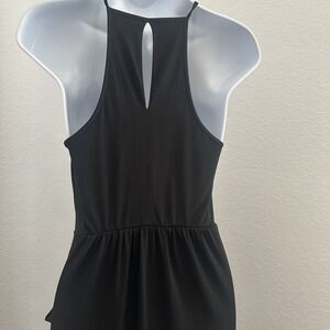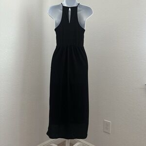 New with tags! Dress features a pull on entry with a spaghetti strap halter neck line, surplice bodice with a snap closure, front pleating with two front pockets, side kick pleats and an elastic waistband.