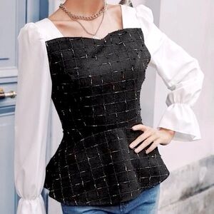 New! Women’s Chic and sophisticated Flounce Sleeve Peplum Plaid tweed Blouse. Size Medium. Sweetheart neckline and ruffle hem. Pullover with side zipper for closure. Super cute. Casually elegant. *Belt not included *
