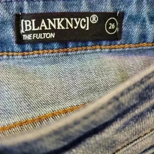 NWT. Elevate your casual wardrobe with these stylish Blanknyc The Fulton Roll Up Distressed Denim Shorts in size 26. The solid blue color and classic American theme make these cut-off shorts perfect for walking or school. The denim fabric is made of spandex and cotton, providing a comfortable and stretchy fit. The waist size is 26 inches with a flat front design, and the shorts feature various aspects such as vintage style and regular fit, making them suitable for any occasion.